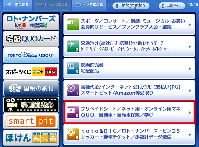 Select " プリペイドシート/ネット用・オンライン用マネーQUO/自動車・自転車保険/学び [Prepaid sheet; QUO internet and online money; Car and Bicycle Insurance; learning;, etc.]"